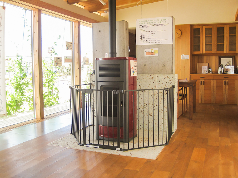 ストーブは木質ペレットを燃料としています。輻射熱で部屋を暖めるとともに、天気が悪い日には補助熱源として不凍液を温めてファンコイルに流して温風を吹き出、床下暖房にも使われています。