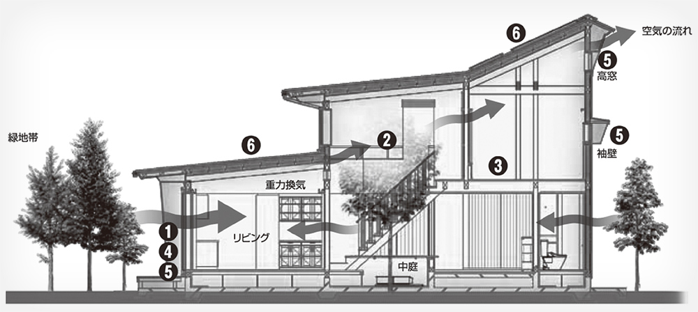 そんな気象条件を踏まえ、冬以外の昼間は、南西から心地良い風が吹くこの地にエコハウスを建設するなら、兼好法師の「すまいは夏を旨とすべし」がごとく、閉鎖型の高気密高断熱仕様を押さえながらも、パッシブな先人の知恵を現代に置き換えた開放型住居を提案しました。