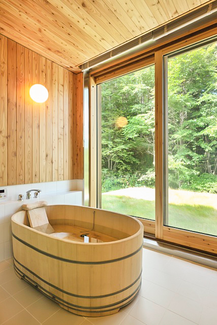 内部は引戸を開放すれば部屋がつながるようになっています。宿泊体験者の一番人気は檜浴槽のある露天風呂のような浴室でしょうか・・・。しっかりした外皮の中に大らかな空間があることで、厳しい自然の中でもエコハウスに必要な技術を実感できます。