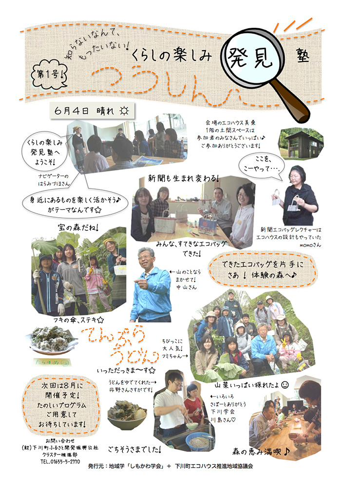 その様子を、少しでも多くの方々に知っていただくため、毎回「発見塾つうしん」を発行して、周知にも努めました。たった5回のセミナーでしたが、終了してからも、参加者の中から「特別編」として発見塾を引き継いでくださる方が出てきたり、セミナーでエコハウスを初めて訪れた方々がその空間を気に入って宿泊体験してくださったり、楽しみだけでなく素敵な人材も発見しながら、地域にちょっとした種まきが出来たのでは…と思っています。
