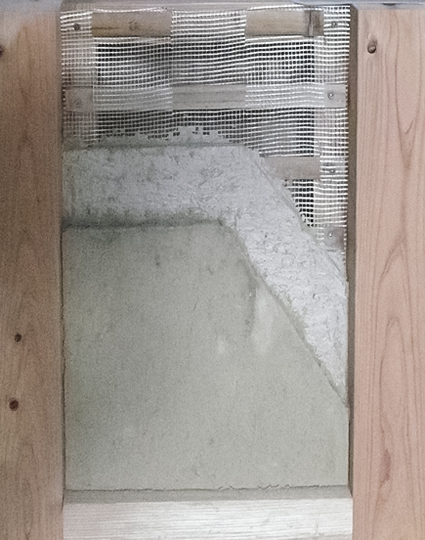 漆喰塗り・ラスモルタル15・アスファルトフェルト・バラ板12・通気層45・透湿透風防水シート・木質繊維断熱材80・高耐水MDF板9・荒壁パネル26・中塗り仕上げ