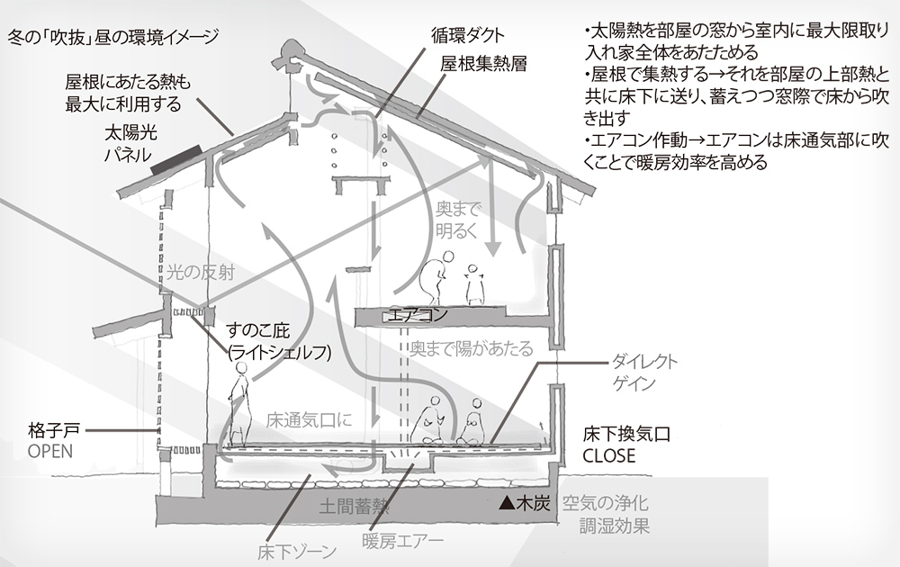 このような地域の環境、景観のコンテクストを重要視しながら、現代のエコデザインと最先端技術のエコシステムを積極的に導入することが求められました。省エネ、創エネなどの現代技術はもちろんですが、古くから民家で使われている土壁や木格子などの伝統的要素、光や風、建築的工夫による熱のコントロールなどで得られる居住空間の快適性をデザインすることが、21世紀の豊岡ならではの豊かな住まいの提案だと考えました。