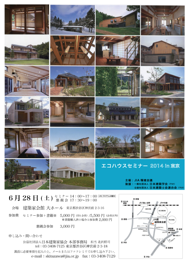 エコハウス・プロジェクトの最前線を紹介するエコハウス・セミナーが。6月28日(土)午後2時から東京のJIAで開催されます。「エコハウスへの誘い」や「エコハウス・ポータル」の紹介や解説とともに、省エネ義務化に向けての情報、エコハウスの設計者によるエコハウスの経験を活かした最新の住宅の解説、設計者と研究者による座談会など、盛りだくさんの内容です。