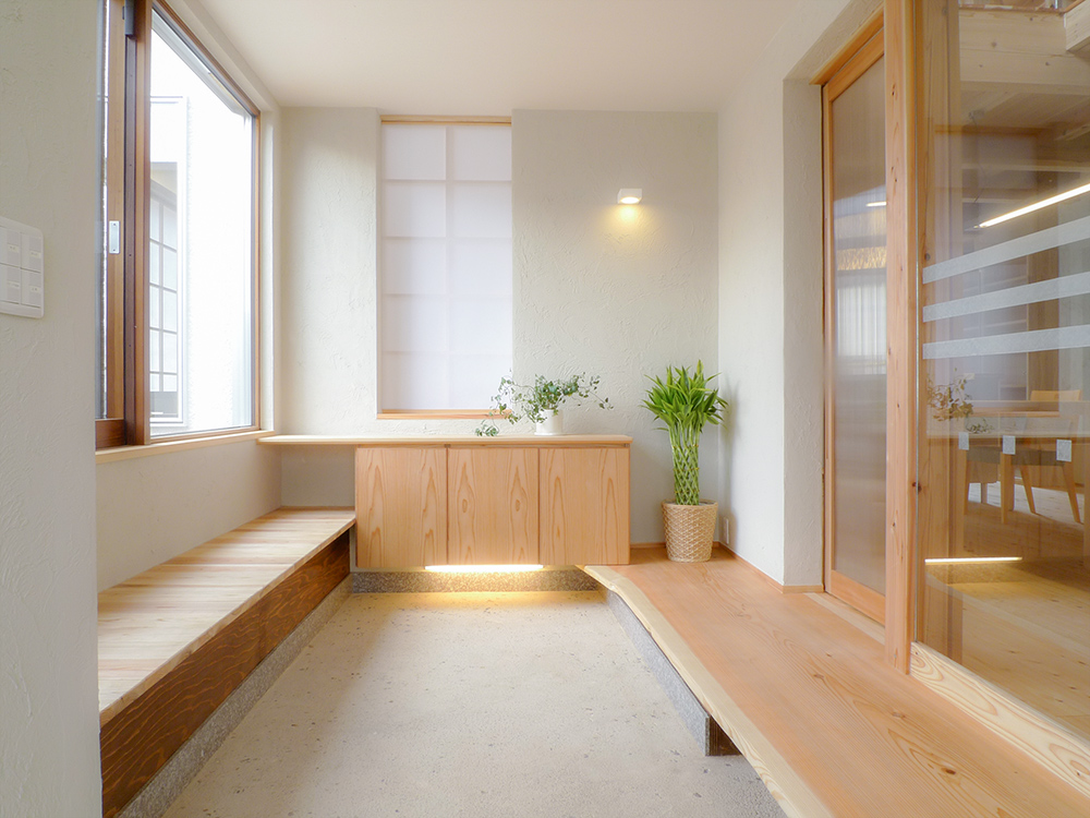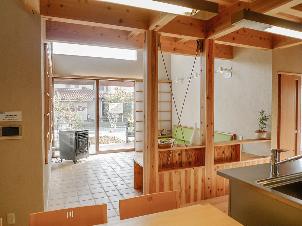 内外装材には県産材縁甲板、シラス火山灰塗壁、えごま油塗料、羊毛断熱材等、自然素材と地域産材が積極的に採用されています。